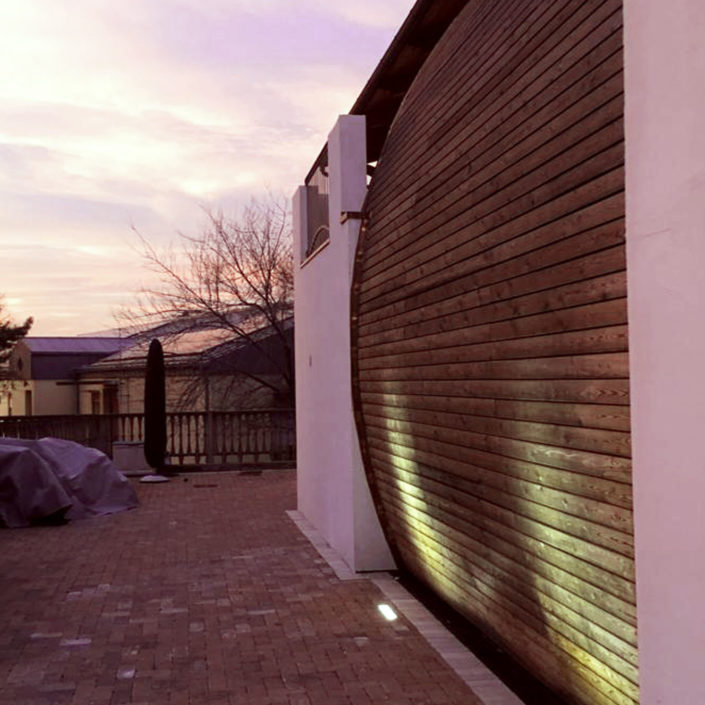 Il primo, un volume cubico, pieno, sviluppato solo al piano terra e di soli 9 mq, a copertura piana con funzione d terrazza. Un secondo ampliamento di due piani realizzato interamente in legno dalla forma “a botte” rinominata “vela”, per potersi inserire, incastrare, elegantemente tra il piccolo cubo del primo ampliamento ed un nuovo muro a doppia altezza sul fronte principale dell’edificio.