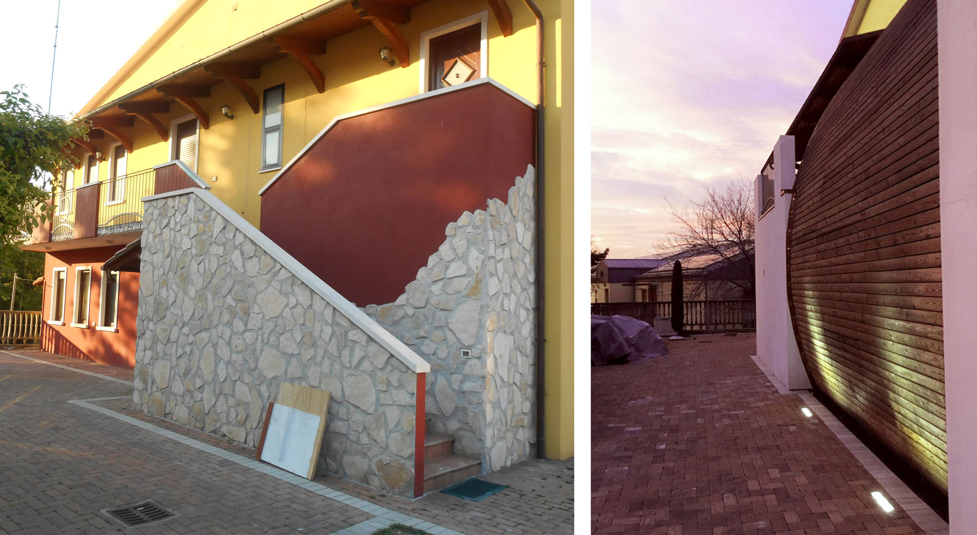 Questo fronte fa parte di una storica cortina murale della via collinare e caratteristica del paese in cui si trova, pertanto è stata posta particolare attenzione a riproporre gli stessi elementi ornamentali del corpo di fabbrica di cui avrebbe fatto parte.